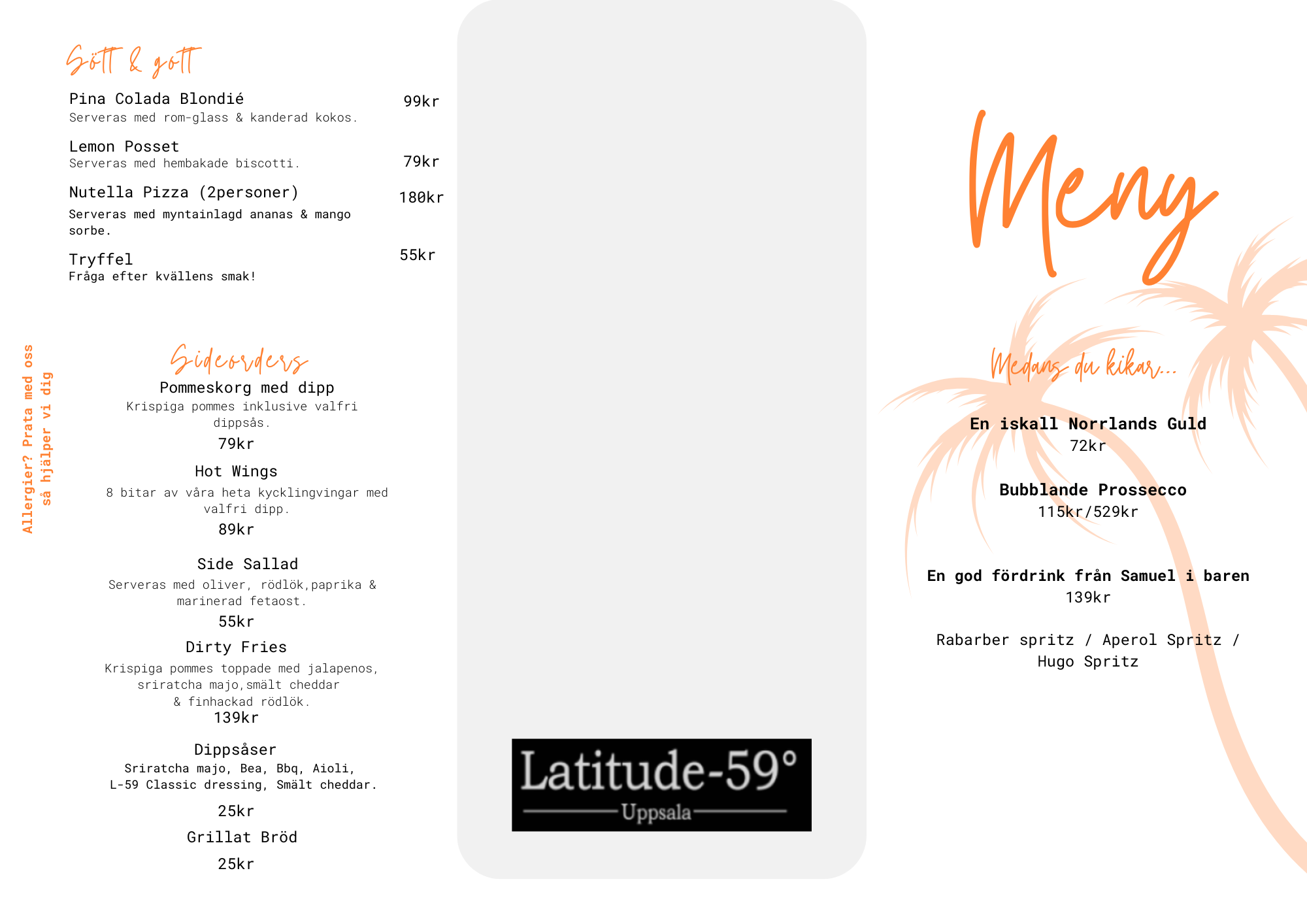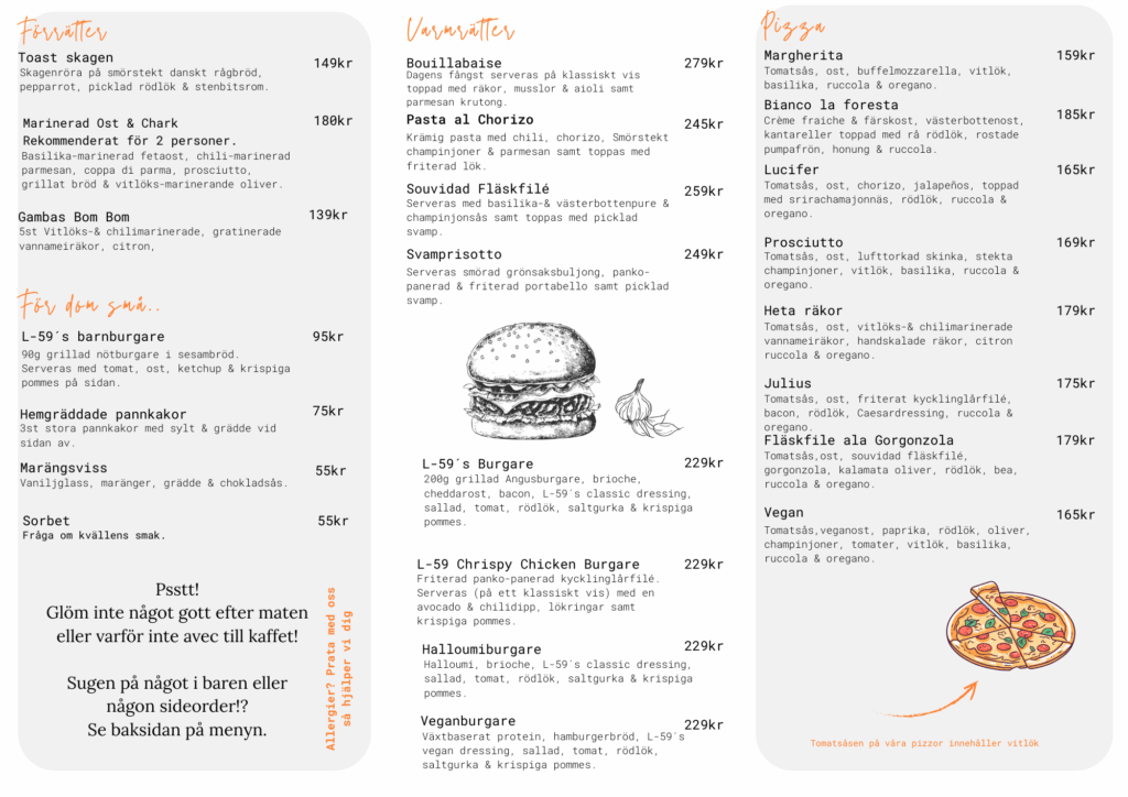 A la carte Meny Välkommen in! Meny Förrätter, Varmrätter & BarnmenyLadda ner Meny Dessert & Side ordersLadda ner